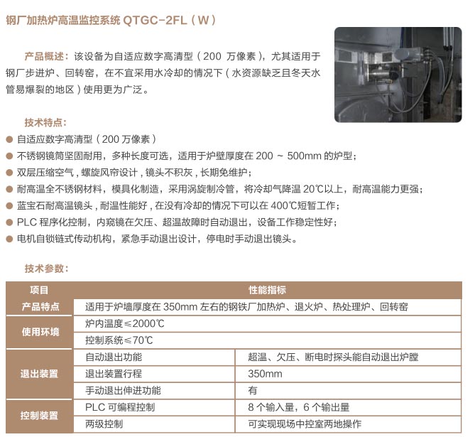 爐窯高溫監(jiān)測監(jiān)控系統(tǒng)是專為工業(yè)高溫爐窯監(jiān)測監(jiān)控的設(shè)計的智慧管理平臺,是針對爐壁開孔和爐窯視像有嚴格要求的高溫爐窯而研制的高溫工業(yè)電視。利用特種高溫孔式光學(xué)鏡頭,鏡頭設(shè)計采用中繼物鏡,兩次成像系統(tǒng),使像面在遠離觀察孔的CCD靶面上形成,最大限度的減少進入攝像機的熱輻射,致力為冶金、電力、建材、礦山、化工等行業(yè)服務(wù)。我公司研發(fā)主導(dǎo)產(chǎn)品已擁有第三代SG內(nèi)窺式高溫工業(yè)電視系列、爐壁式高溫工業(yè)電視系列、內(nèi)窺式拐角高溫工業(yè)電視系列、鍋爐汽包水位電視系統(tǒng)等成套設(shè)備,以及各種風(fēng)冷防護罩,水冷防護罩,渦旋制冷防護罩等工業(yè)監(jiān)控設(shè)備配套產(chǎn)品。產(chǎn)品廣泛應(yīng)用于鋼鐵廠加熱爐、退火爐,電廠鍋爐爐膛火焰、水泥廠回轉(zhuǎn)窯窯頭看火、篦冷機看料、玻璃廠玻璃熔窯等特殊高溫環(huán)境。幫助用戶進行工業(yè)爐實時電視監(jiān)測及控制,解決設(shè)備的運行故障等,對用戶改善產(chǎn)品質(zhì)量、降低成本、安全生產(chǎn)有著獨特的成效。受到了用戶的一致好評。